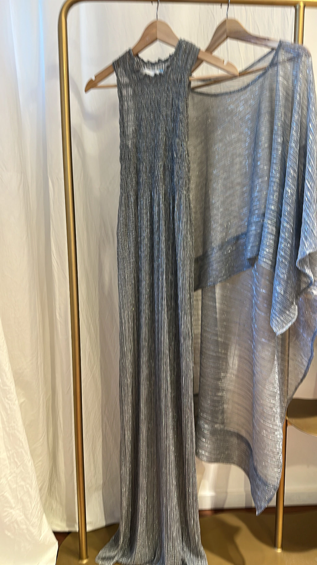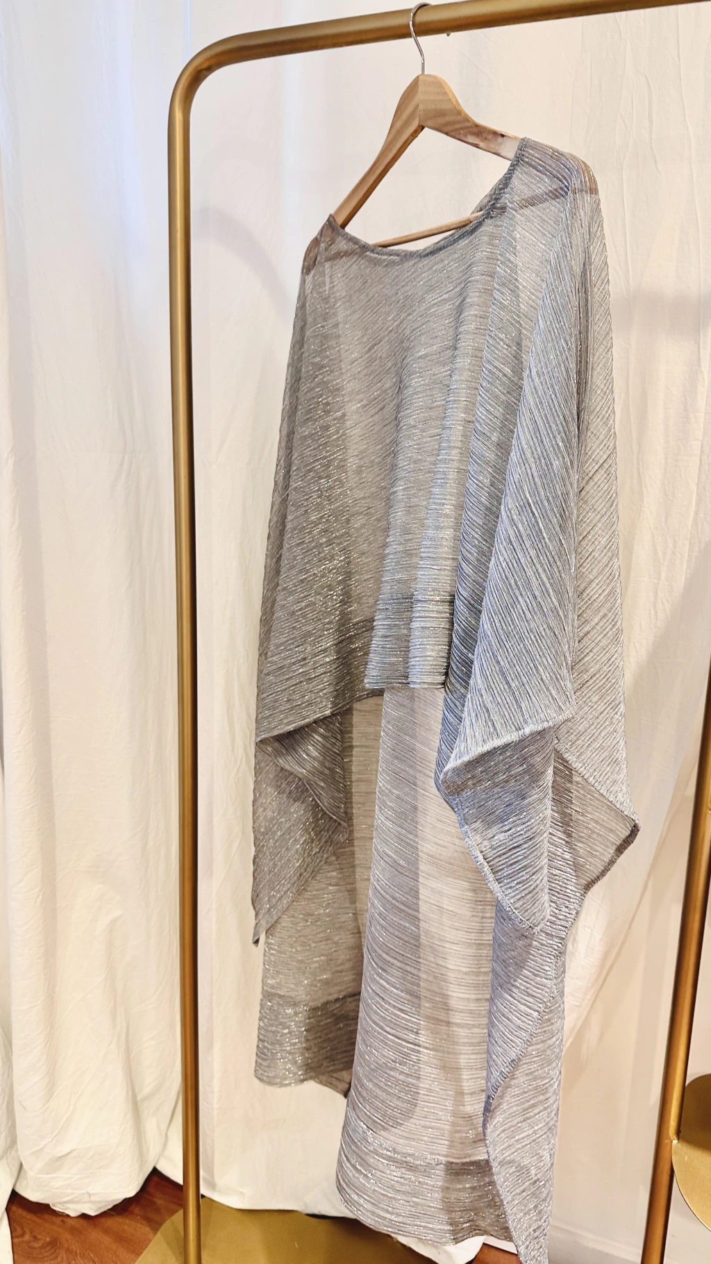 Descubrí nuestra espectacular Capa Moncloa, confeccionada en un plizado con lurex plata, es la solución perfecta para una fiesta de verano, cuando queres ir un poco cubierta, pero no muy abrigada, te cubre pero tiene transparencia Y lo mejor de todo que tiene muchas formas de uso! El corte es irregular, el delantero es un poco mas corto que la espalda.
