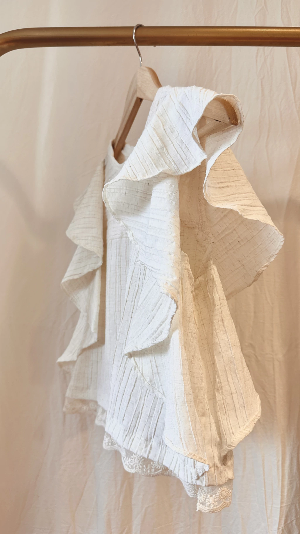 Descubrí el nuevo Top Cibeles confeccionado en lino labrado plizado. Tiene un canesu en un tejido tramado en el mismo tono, y dos vuelos a sus costados que van desde el hombro hacia abajo. En el ruedo lleva un aplique de tul bordado. El corte es evasé y el fit es amplio, es un top con detalles únicos, ideal para combinar con nuestra babucha Fuencarral para un total look.