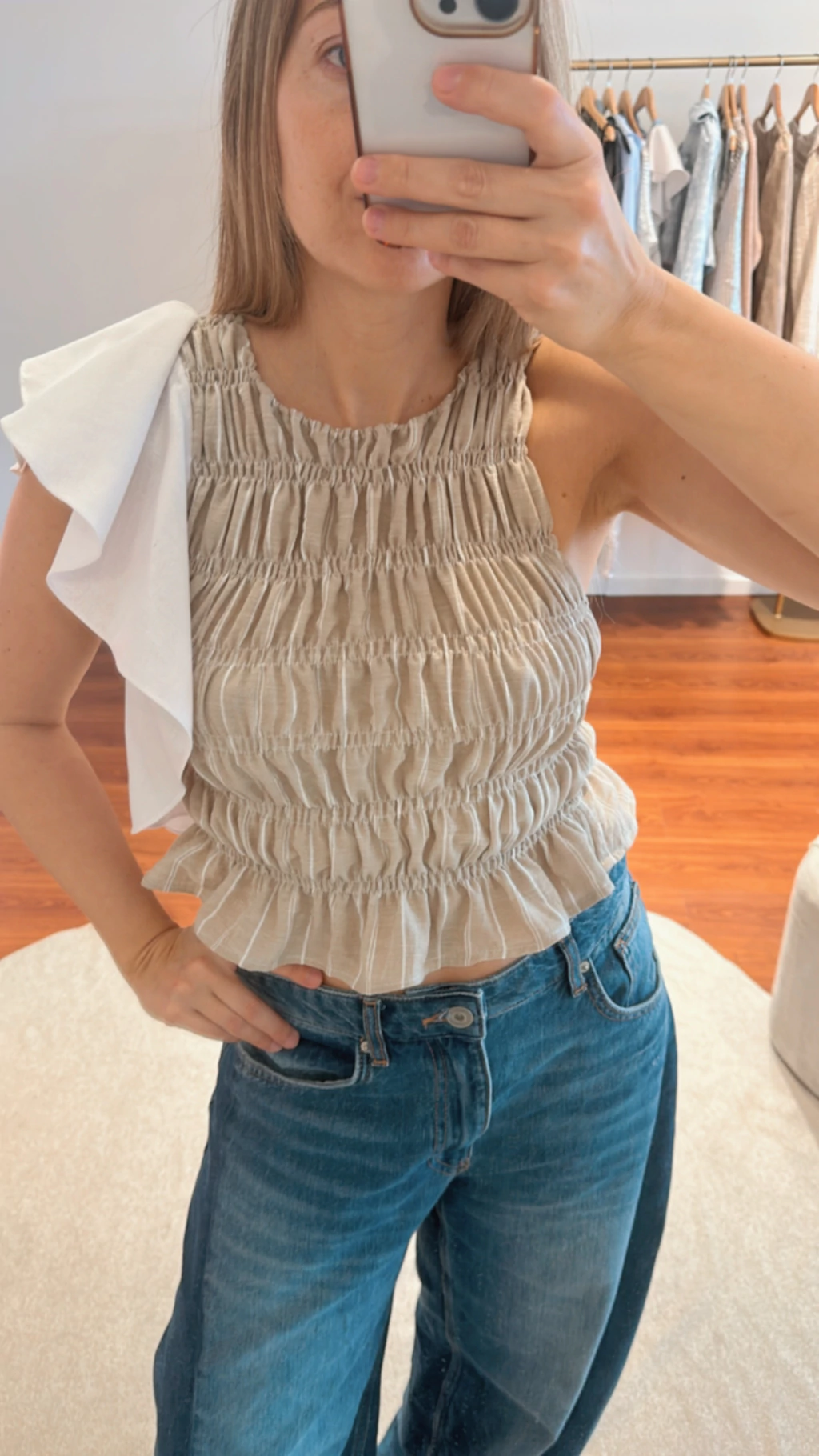 Hola a tu nuevo Top preferido de este verano! Confeccionado en lino a rayas, este top se caracteriza por su drapeado. Con costuras elásticas a lo ancho del mismo, es super elastizado, cómodo y se adapta al calce. Desde uno de sus hombros lleva un vuelo en lino blanco, que va desde el delantero hacia la espalda. Le da ese toque chic!