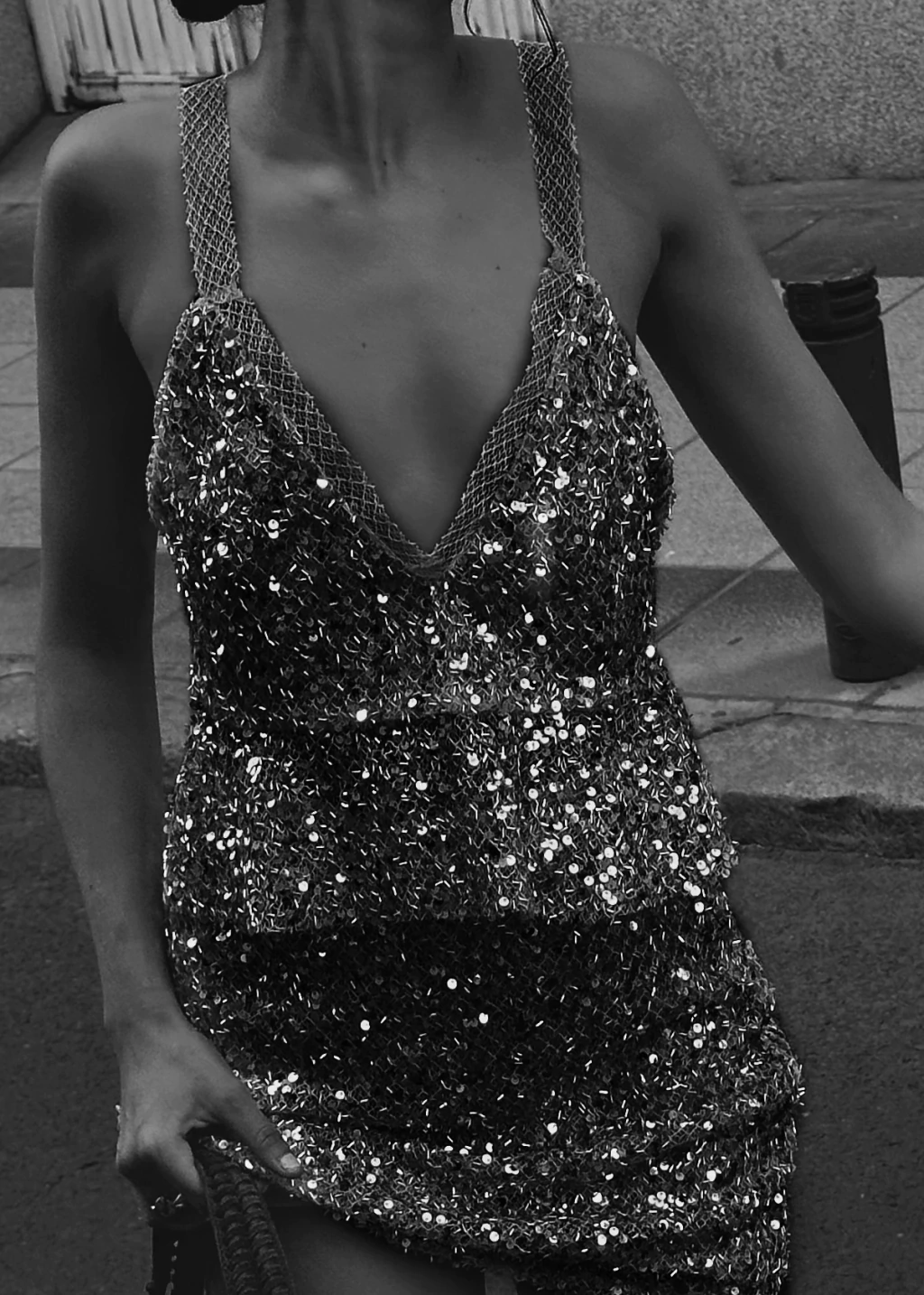 Descubrí el nuevo Top Peltre y salí a brillar! Confeccionado en una red bordada con lentejuelas y canutillos en color peltre. Su escote es en V, y lleva un vuelo en el ruedo que va desde el delantero hacia la espalda. La espalda es descubierta, podes regular el largo de los breteles y el ancho de la espalda anudando los lazos como te gusten. El forro en el busto es un jersey de seda elastizado a tono con el top. Combiná nuestro Top con la MIni Latina para un total look monocromo. Después usarlos por separado, es lo que más valoro, versatilidad puesta al servicio de un look ;).
