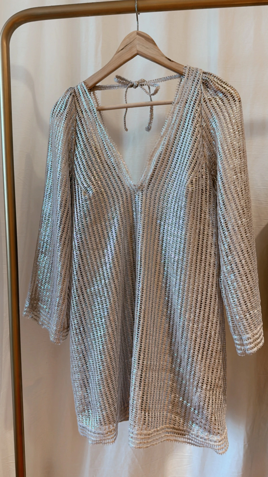 Vestido corto confeccionado en tejido tipo red de algodón con foil. La tipología del vestido es evasé, y la silueta es holgada, tiene escote en V en delantero y la espalda es más profunda, lleva un lazo finito para anudar. Las mangas son largas y oxford, lleva un recorte transversal de la tela en el puño y también en el ruedo del Vestido. Podes llevarlo con la enagua o el culotte haciendo juego.