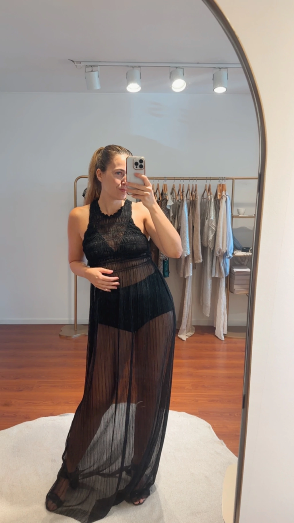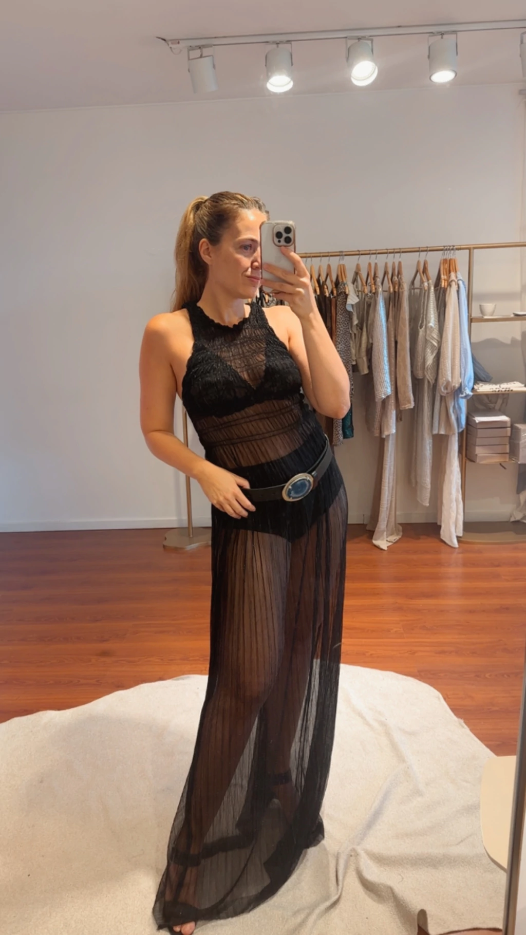 Descubrí nuestro nuevo Vestido largo confeccionado en plizado con lurex. De escote halter, lleva un drapeado con hilo lastico en la parte superior hasta la cintura, y desde ahí cae la falda de corte evasè hasta el ruedo luciendo la transparencia de la tela. Ideal para usar con nuestro Culotte bai bai. Es cómodo y versatil, para llevar a una boda o fiesta de finde año, o usarlo más casual con una campera de cuero o jean, para un look más informal.