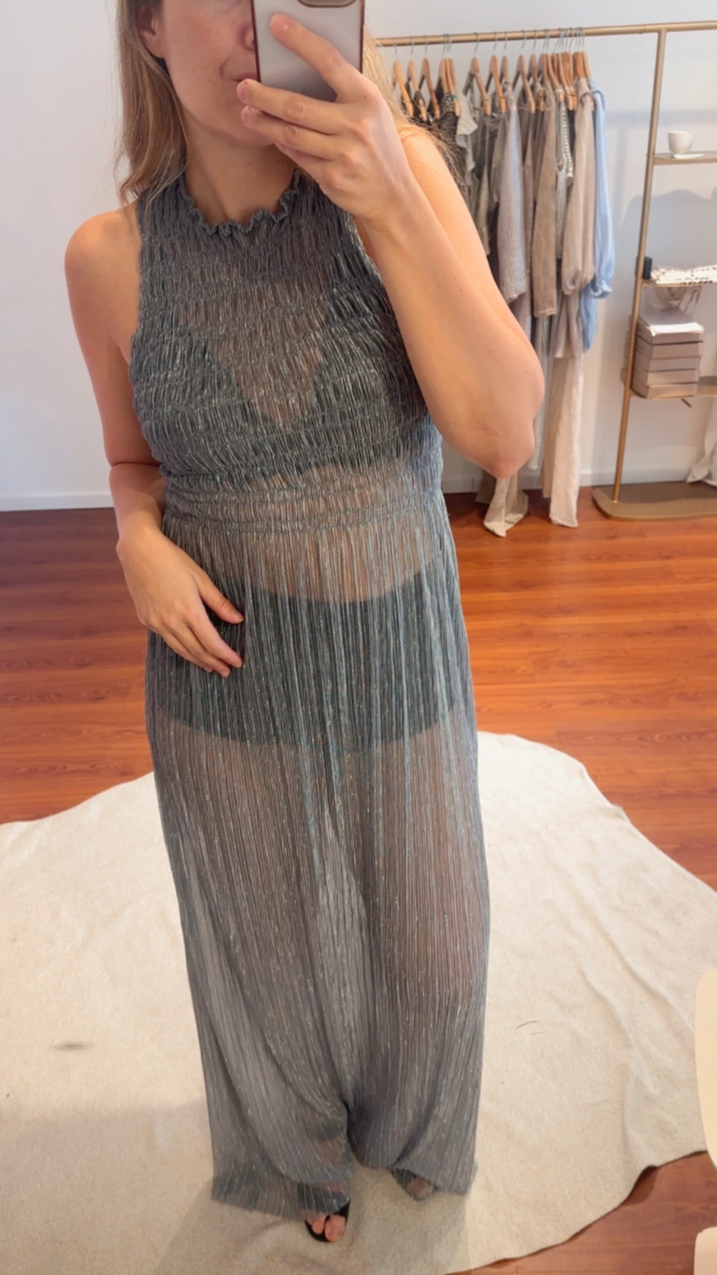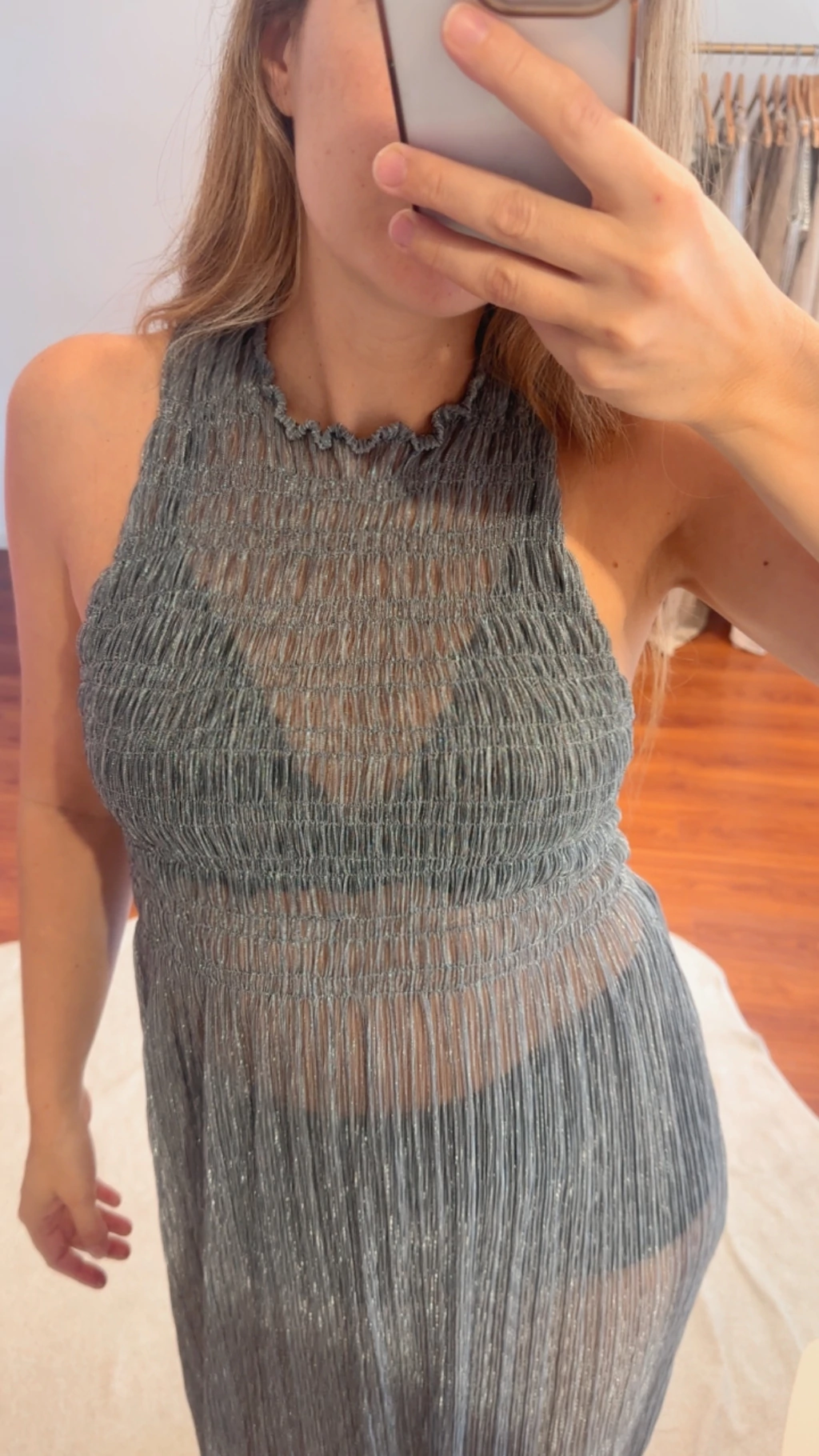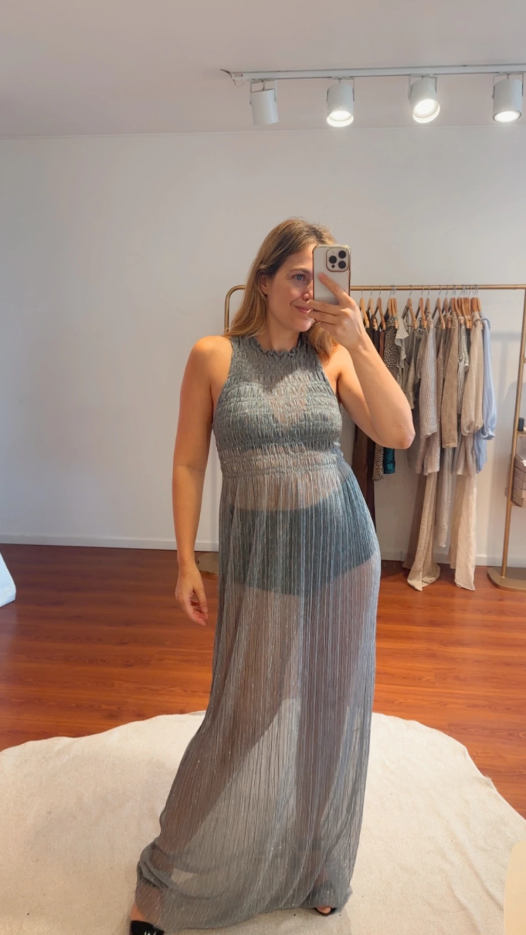 Descubrí nuestro nuevo Vestido largo confeccionado en plizado con lurex. De escote halter, lleva un drapeado con hilo lastico en la parte superior hasta la cintura, y desde ahí cae la falda de corte evasè hasta el ruedo luciendo la transparencia de la tela. Ideal para usar con nuestro Culotte bai bai. Es cómodo y versatil, para llevar a una boda o fiesta de finde año, o usarlo más casual con una campera de cuero o jean, para un look más informal.